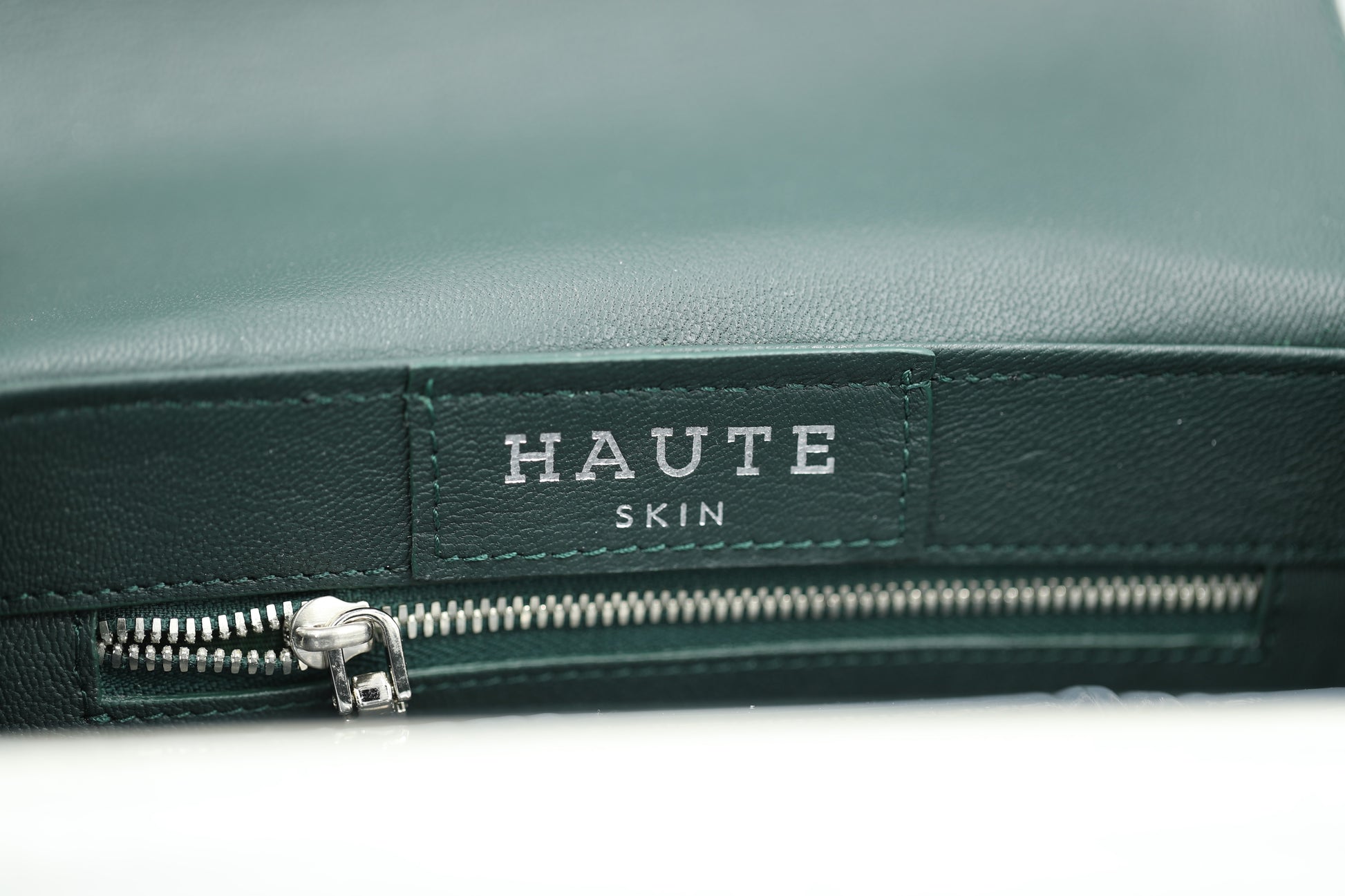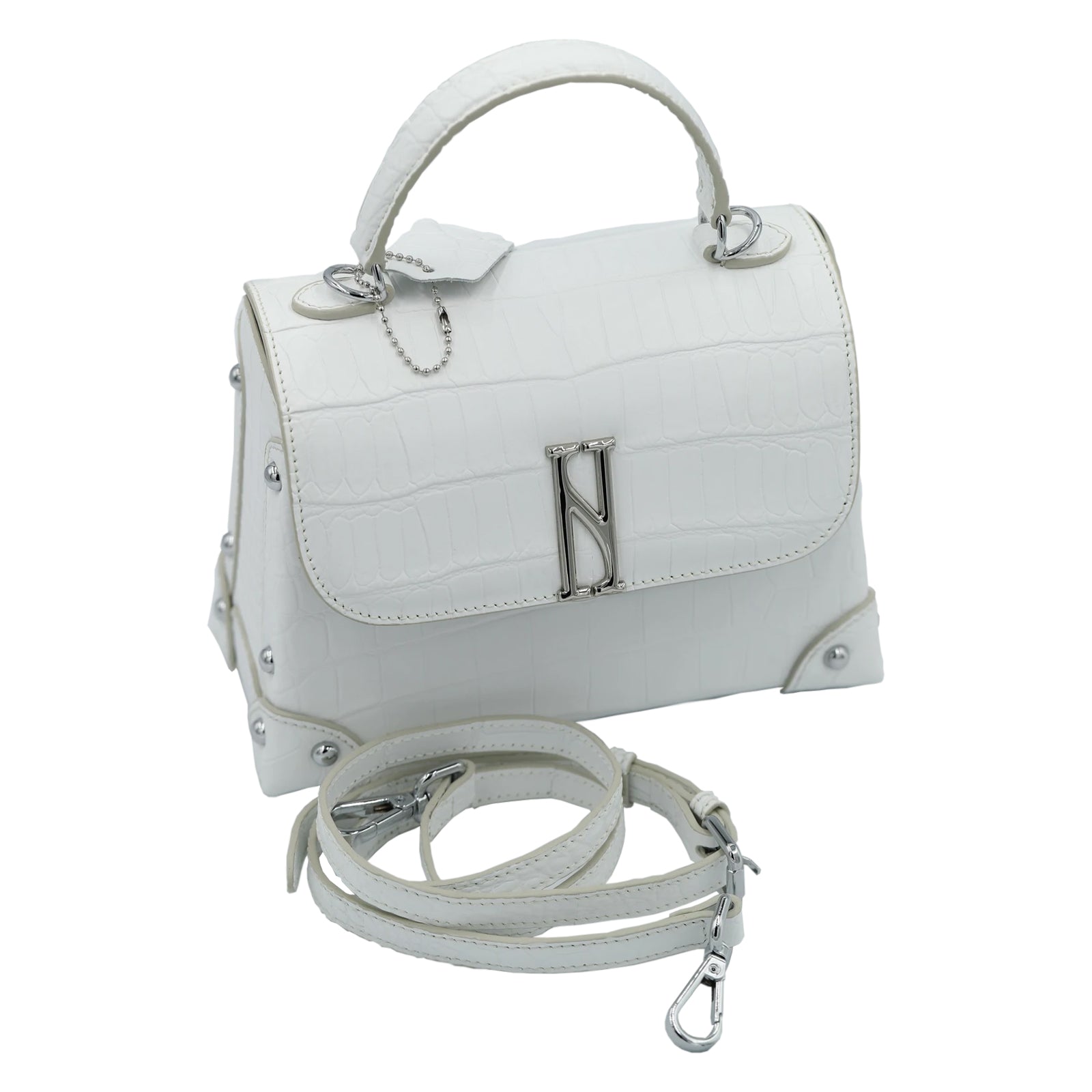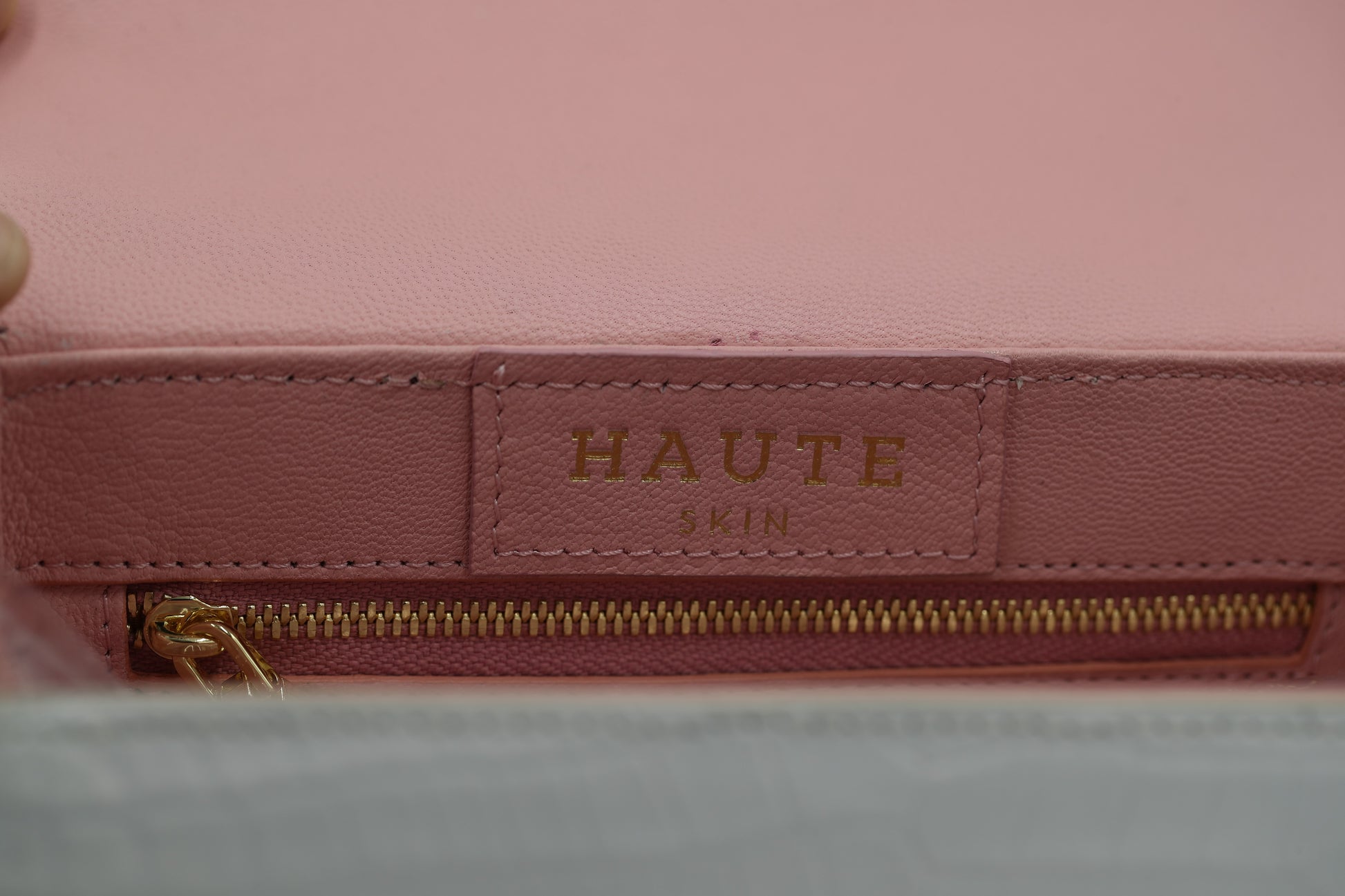This HAUTE SKIN mini trunk bag is fashioned from snow WHITE , designed to make a statement. Impeccably crafted, with a beautiful softest lamb lining in tender pink color this "little trunk" will bring out the romantic side of you to own the night!